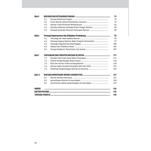 Biochar untuk Mengatasi Lahan Terdegradasi dalam Ketahanan Pangan ini disusun sebagai solusi mengatasi lahan terdegradasi dalam meningkatkan dan mendukung ketahanan pangan, sarana berbagi pengetahuan mengenai biochar, atau yang kerap disebut “arang hayati aktive”. Bahan ini dihasilkan melalui proses pirolisis dengan berbagai enerji panas sesuai dengan material bahan asal seperti: limbah organik, mulai dari sekam padi, tempurung kelapa, hingga limbah pertanian dengan kandungan karbon tinggi. Karakteristik Biochar hasil dari bahan limbah organik, biochar dipercaya efektif memperbaiki Kadar Karbon stabil dalam tanah, Pertukaran kation tanah untuk ketersediaan nutrisi tanah, meningkatkan daya serap air, menahan hara bersifat sementara yang disimpan dalam void atau rongga, sekaligus dapat meningkatkan Kesehatan sekitar daerah perakaran dengan mengkondisikan kehidupan mikroba tanah yang bermanfaat bagi pertumbuhan tanaman. Fenomena degradasi lahan semakin nyata kita saksikan di berbagai wilayah Indonesia. Pergeseran untuk alih fungsi lahan, Penggunaan pupuk kimia secara berlebihan tanpa diimbangi teknik pengelolaan tanah yang baik, hilangnya hutan penyangga, degradasi lahan akibat proses erosi tanah, hingga dampak fluktuasi iklim menjadi faktor utama menurunnya kesuburan tanah. Kondisi ini berdampak langsung pada produktivitas dan kualitas hasil panen, sehingga ketahanan pangan nasional pun terancam. Oleh karenanya, kehadiran buku ini dapat menawarkan harapan baru: solusi perbaikan lahan yang rusak akibat pertambangan atau adanya degradasi lahan secara alami sehingga mengembalikan tanah dari fungsinya yang bersifat ramah lingkungan dan berkelanjutan. Biochar diperoleh dengan memanfaatkan bahan limbah organik, dan Biochar sebagai bahan pembenah tanah relatif mudah diaplikasikan oleh semua kalangan antara lain dari petani skala kecil hingga pengelola lahan luas.